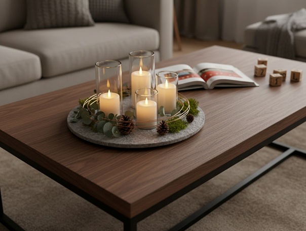 Pokud máte v obývacím pokoji dominantní konferenční stolek dřevo kov, využijte jeho charakter. Přírodní dřevo krásně kontrastuje s kovovými prvky a umožňuje vyniknout jemným detailům. Místo tradičního věnce zkuste například čtyři samostatné svícny rozmístěné do geometrického tvaru, doplněné drobnými větvičkami eukalyptu, šiškami nebo kousky mechu. Výsledkem bude dekorace, která působí čistě, moderně a přirozeně.